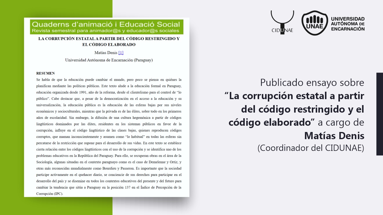 Se encuentra publicado el ensayo “La corrupción estatal a partir del código restringido y el código elaborado” en la revista “Quaderns d’animació i Educació Social” (Cuadernos de animación y Educación Social), revista indexada en Latindex con ISSN 1698-4404 del registro correspondiente del Ministerio de Cultura de España y editada por el Dr. Mario Viché González.